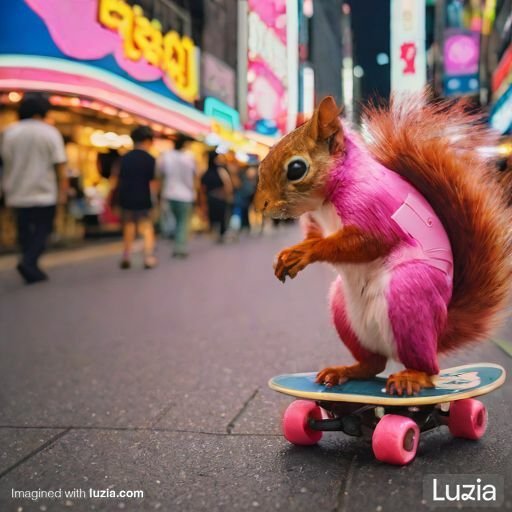 Imagina una ardilla rosa montada en un monopatín por Tokio