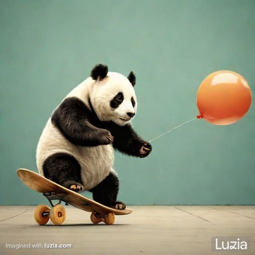 Imagina un oso panda con globo subido a un patinete