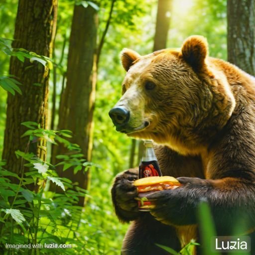 Imagina un oso marrón comiendo una coca cola y una hamburguesa
