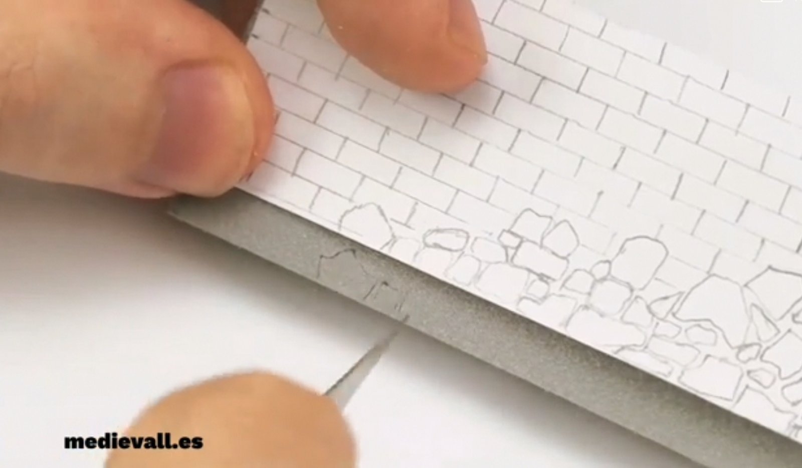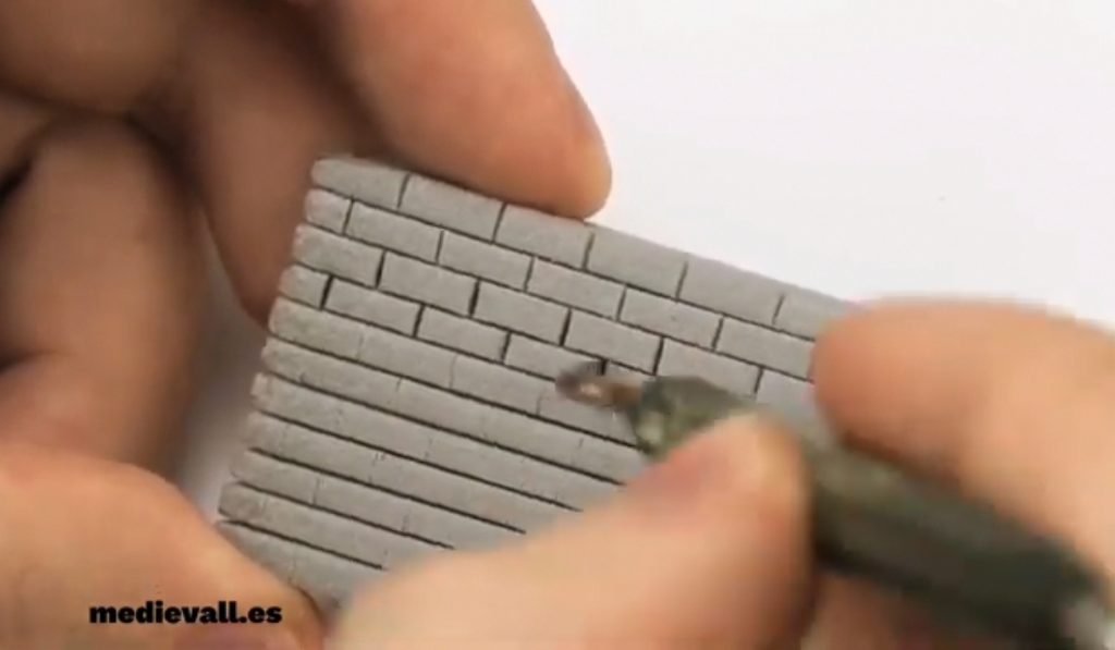 Marca con un punzón o boli fino, las líneas paralelas horizontales del ladrillo, de unos 3 ó 4 milímetros va bien, aunque la medida dependerá de la escala y tamaño de tus miniaturas. Para empezar a aprender hazlos más grandes, te será más fácil.